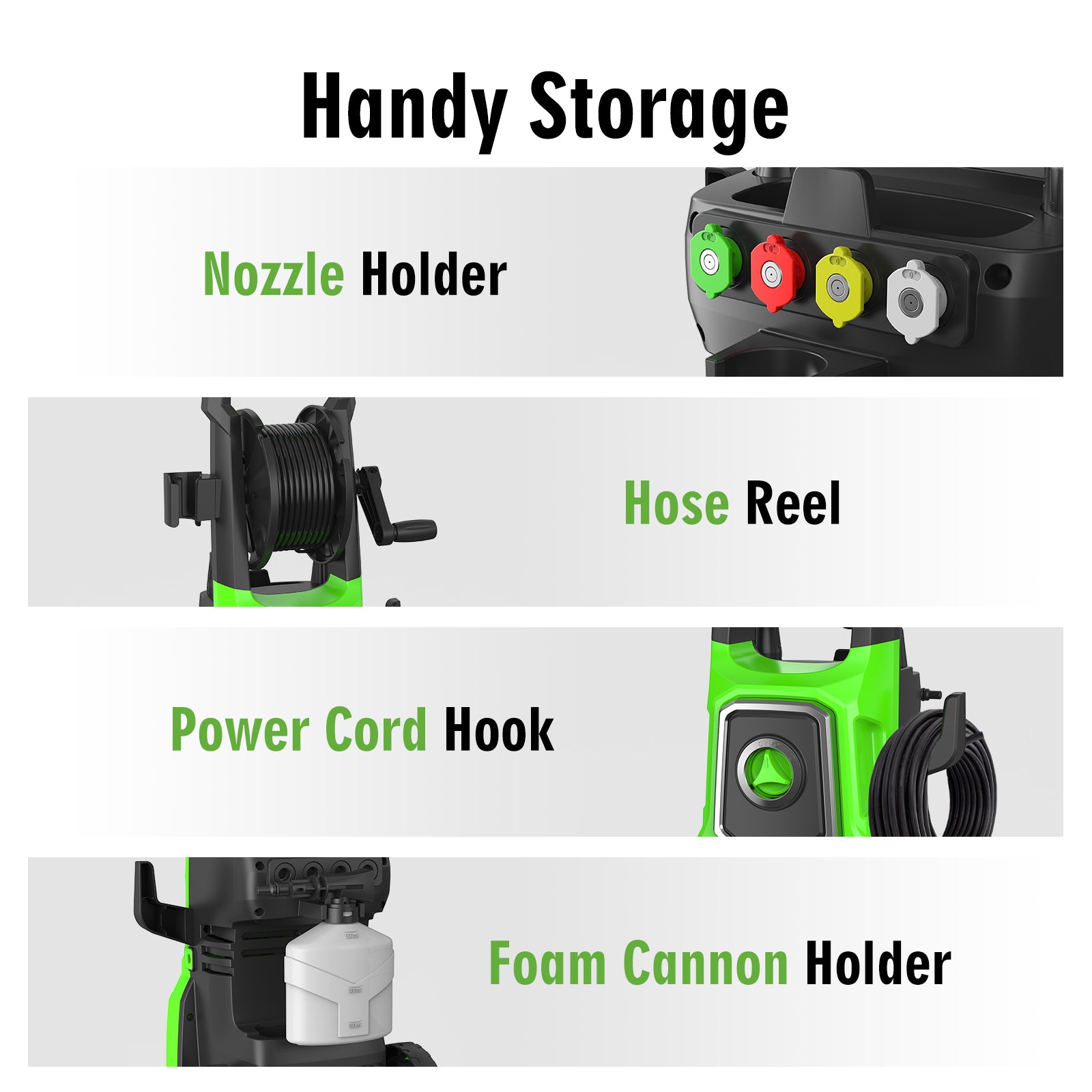 - 【CONVENIENT STORAGE】The Pressure Cleaning Machines are equipped with a power cord hook and nozzle holder for easy access. In addition, its compact design makes it easy to store in a garage or pantry when not in use. The pressure washer is perfect for cleaning concrete, pavement, driveways, patios, decks, sidewalks, RVs, cars, boats, homes, fencing, and more.