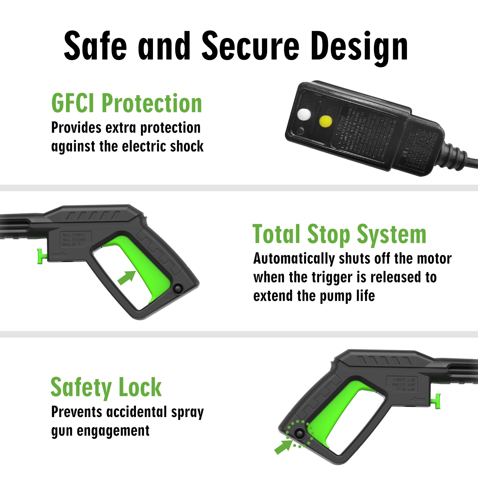 - 【SAVING WATER & SAFETY】The Pressure Washer using high-pressure water flow to clean up the dirt, is currently recognized as the world's most scientific, economical and environmentally friendly cleaning methods. While saving water and energy, it also ensures high cleaning efficiency.