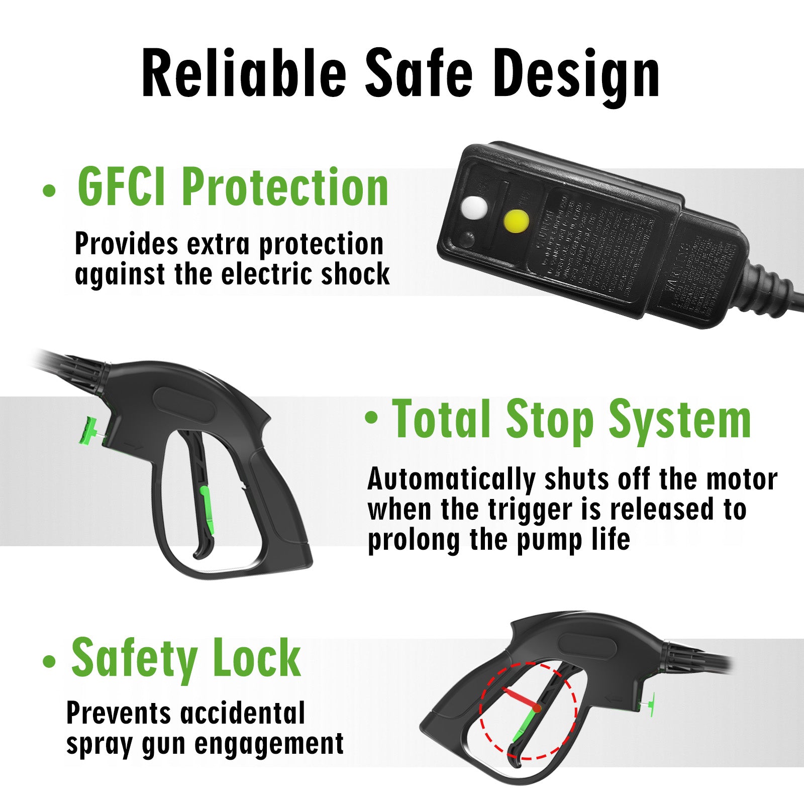 - Professional Safety Design: SWIPESMITH electric pressure washer provides multiple protection: thanks to the Total Stop System (TSS), the motor automatically shuts off when releasing the trigger to extend the pump’s life; the safety lock protects kids from accidentally triggering the spray gun; the GFCI plug provides additional protection from the risk of electric shock.