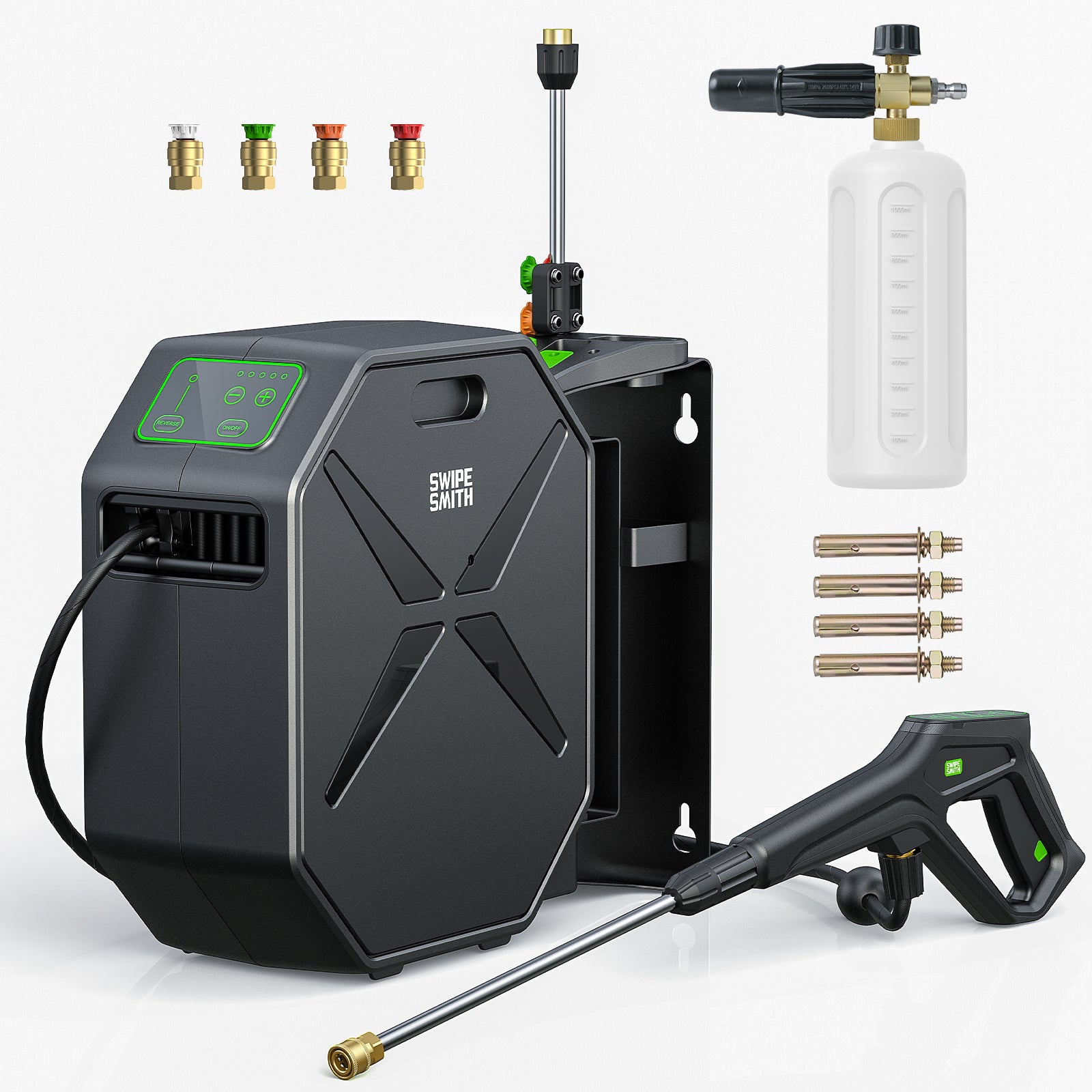 - Wall-Mounted Pressure Washer: Keep your garage clutter-free and save on precious floor space with the SWIPESMITH wall-mounted pressure washer. The 180° swivel design allows for greater flexibility when cleaning, while storage is made hassle-free simply by fixing it to any wall with the included mounting bracket. (Note: Before retracting the high-pressure hose, please shut off the motor and drain any water, otherwise the retraction system may not work optimally)