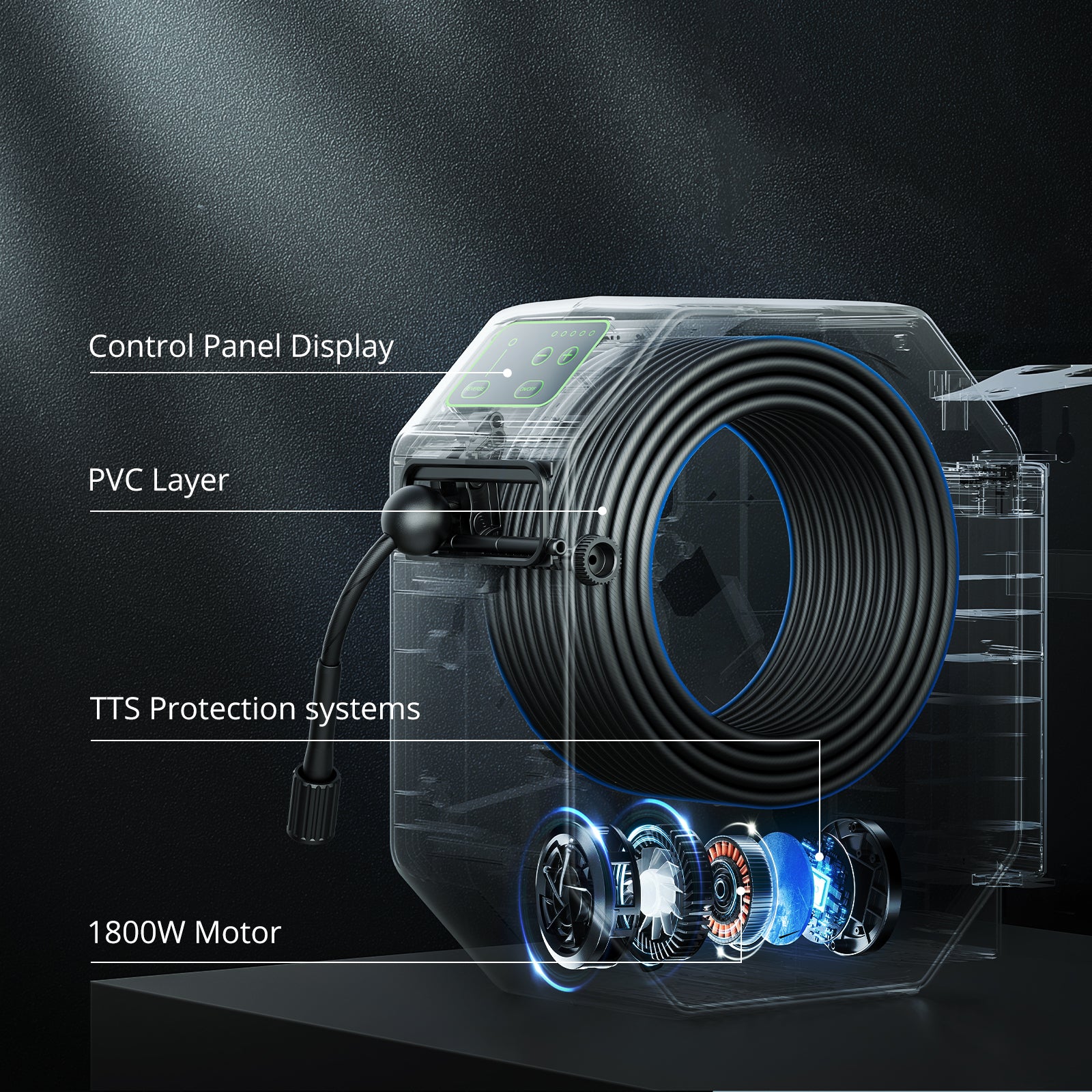 - Retraction Saves Time & Energy: No need to tug it back, the retractable pressure washer hose reel will stably and automatically rewind at the press of a button, protecting the pressure hose from tangling, kinking, and tearing. (Note: Before retracting the high-pressure hose, please shut off the motor and drain any water, otherwise the retraction system may not work optimally.)